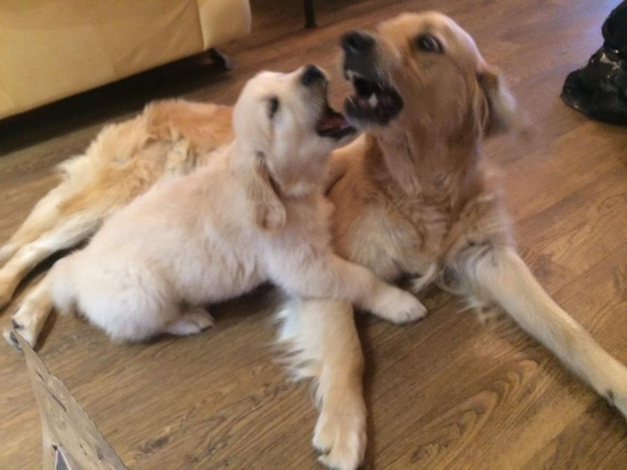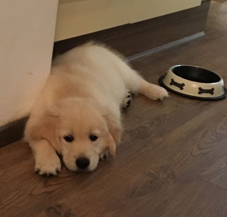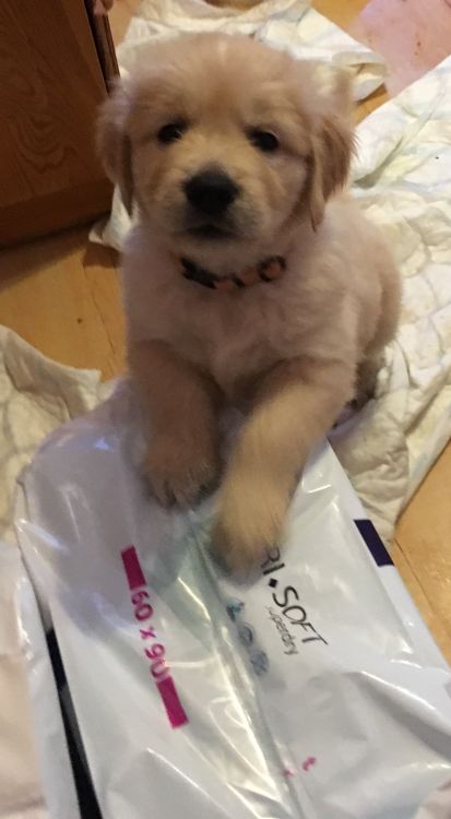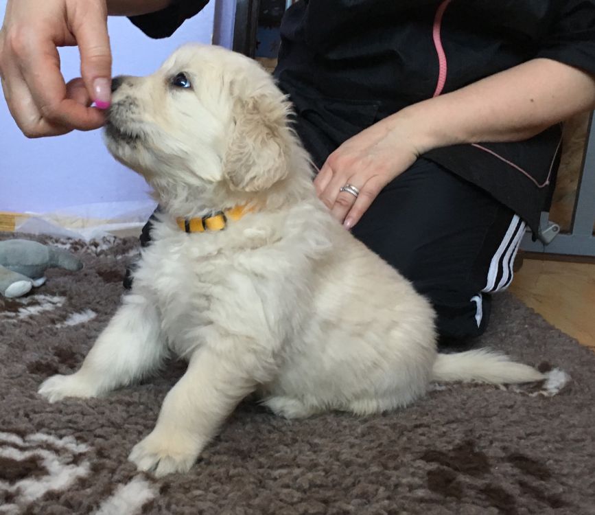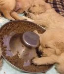 Ve 4.týdnu se toho stalo u našich goldeních zlatíček hodně. Seznámili jsme se s novými páníčky, začali baštit kaši, granulky a piškoty, hrajeme si, pereme se mezi sebou, štěkáme a vrčíme, už nechceme být v porodní bedně a poznáváme okolní místnosti v domě.